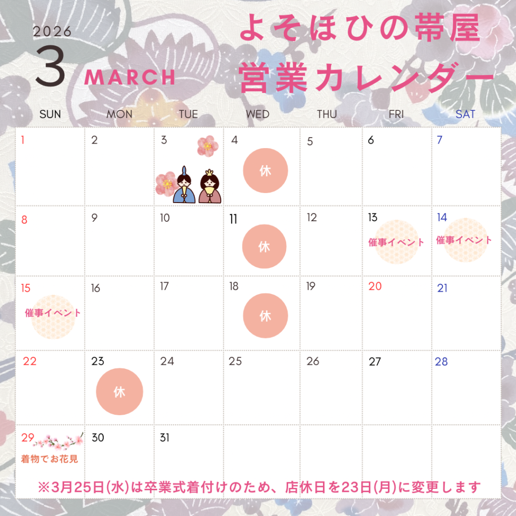 いつも帯屋をご利用いただきありがとうございます。3月は卒業式の関係で、25日(水)は営業し、代わりに23日(月)をお休み いたします。ご不便をおかけしますが、何卒よろしくお願い申し上げます。